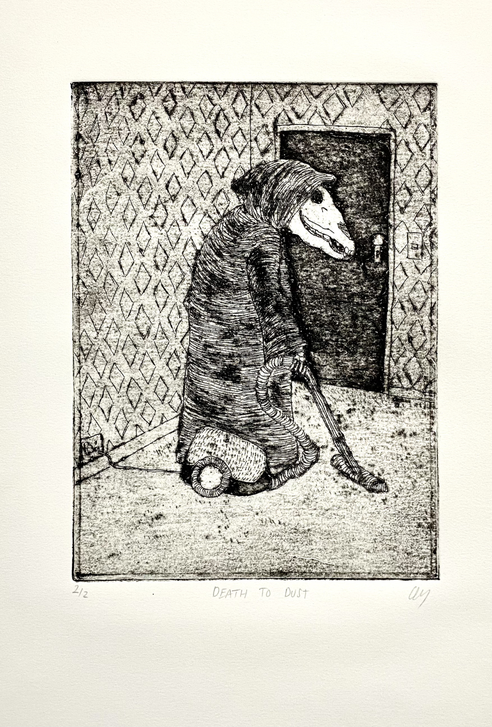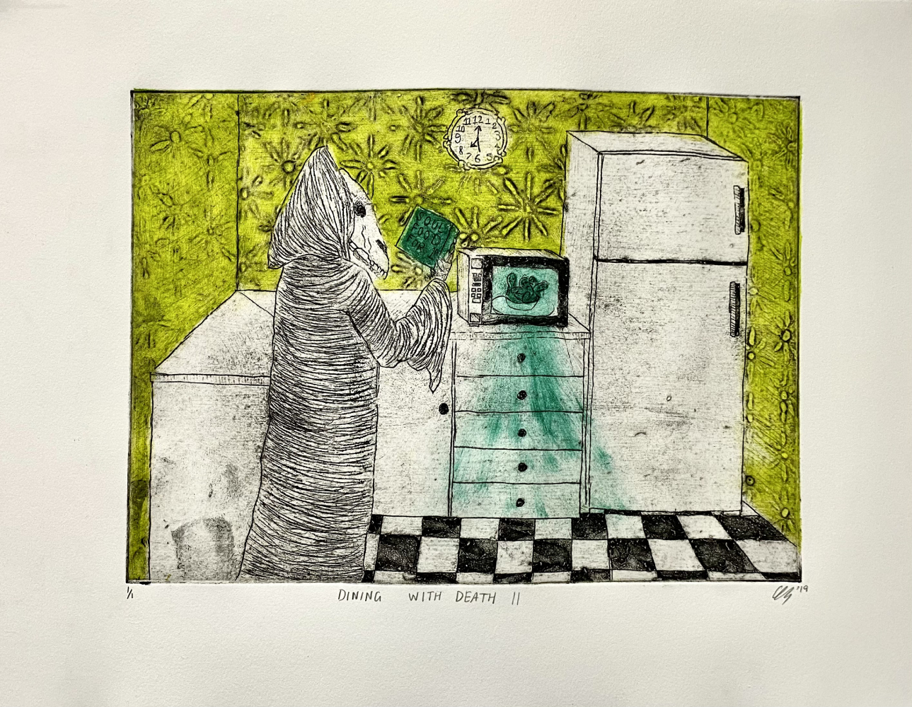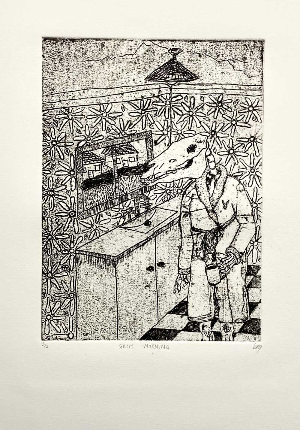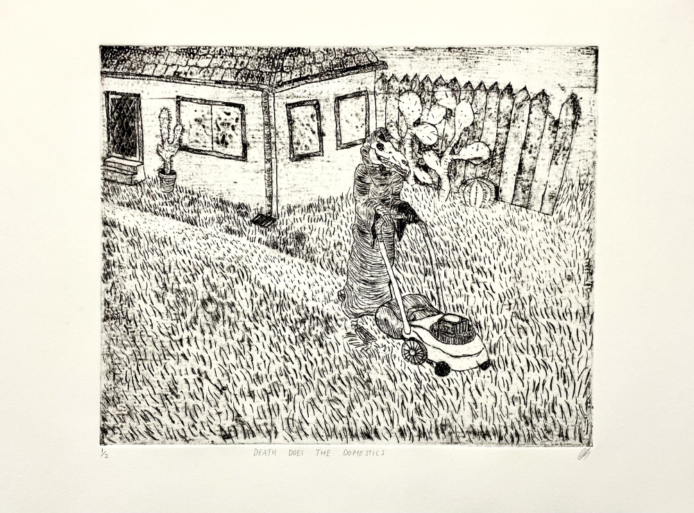 ‘Death in Suburbia’ is a series of collagraphs depicting death as a mundane eventuality as opposed to an ongoing threat. Death comes to us all, but until then he is our neighbour; just someone who lives down the road, who might be sometimes observed taking out his bins or mowing the lawn. The series takes us through a day in the domestic absurd life of death.