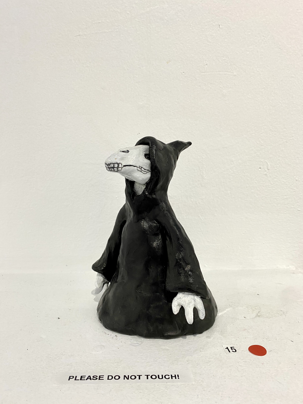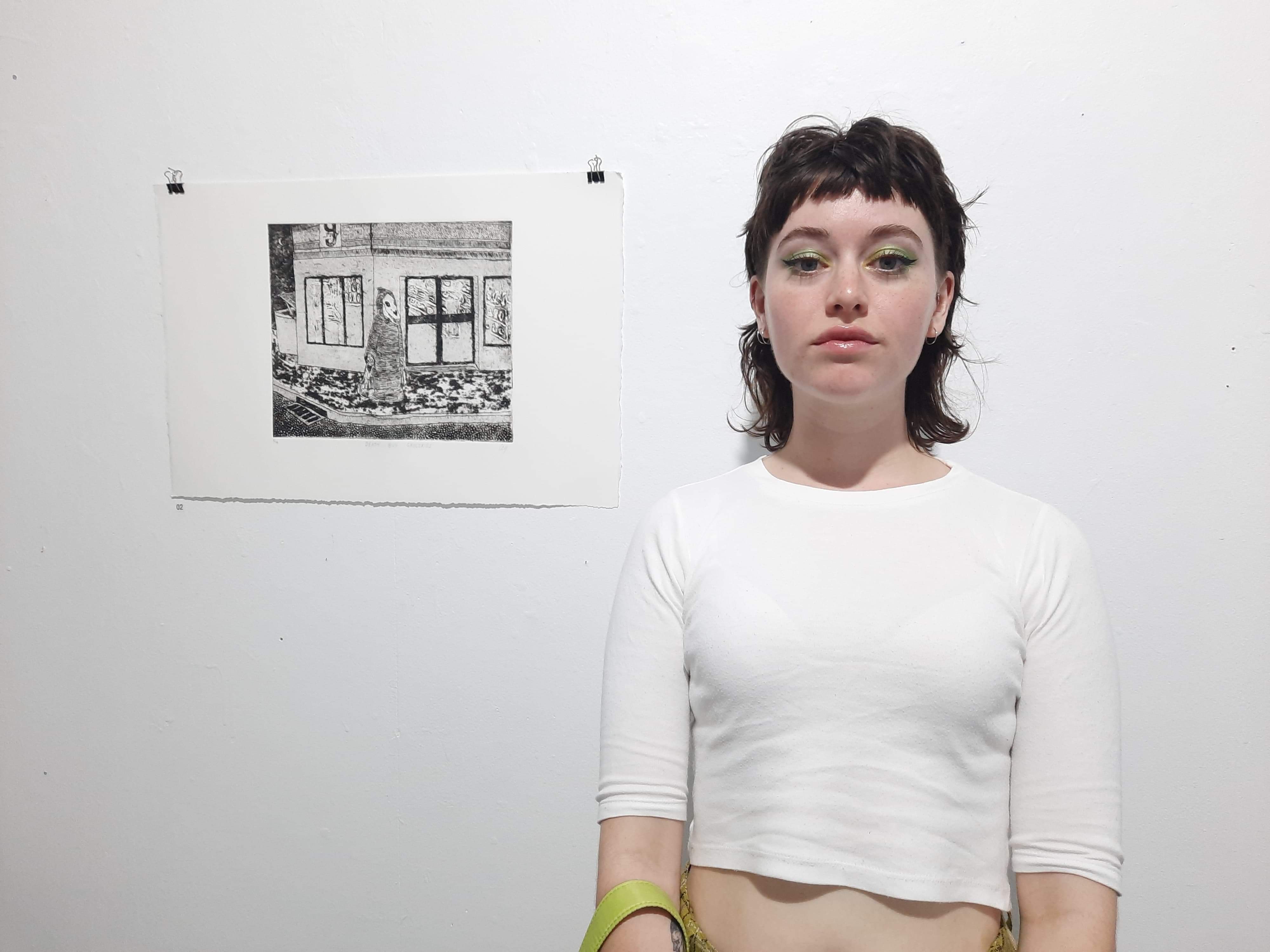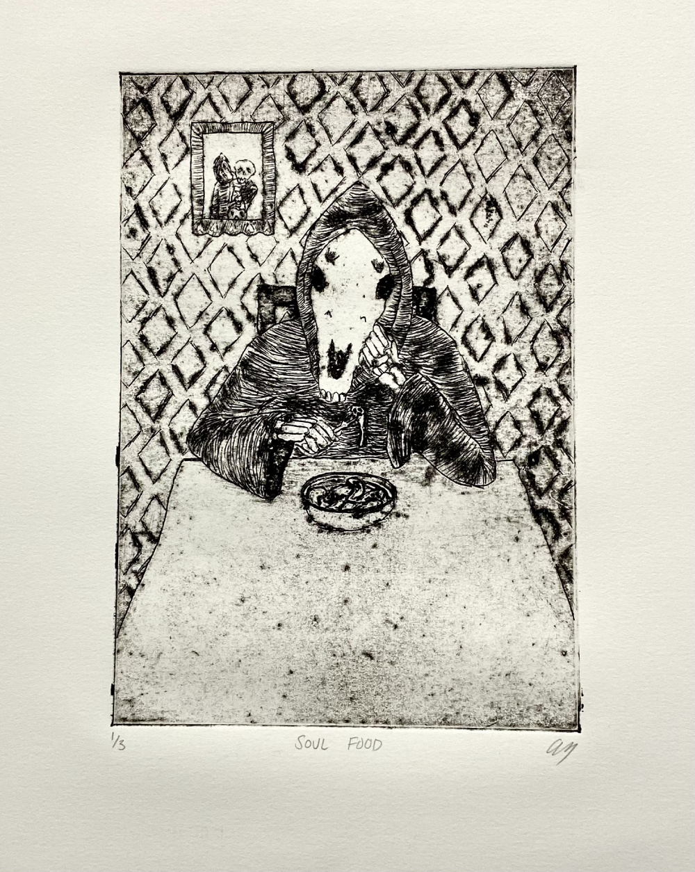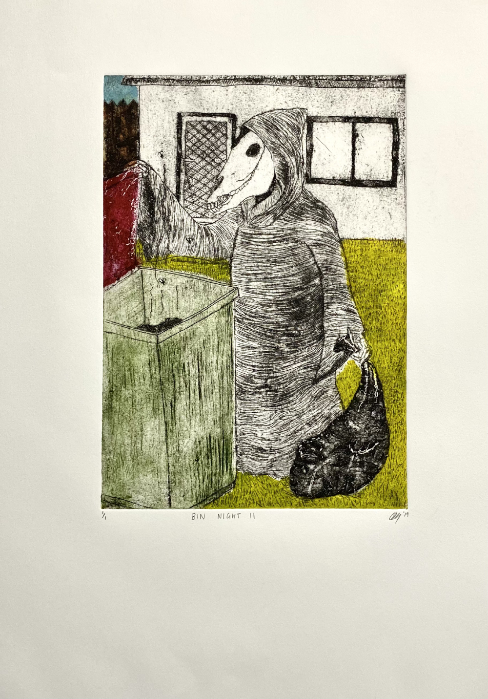 ‘Death in Suburbia’ is a series of collagraphs depicting death as a mundane eventuality as opposed to an ongoing threat. Death comes to us all, but until then he is our neighbour; just someone who lives down the road, who might be sometimes observed taking out his bins or mowing the lawn. The series takes us through a day in the domestic absurd life of death.